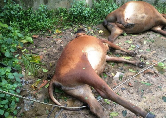 10月18日上午7:00左右,万宁市万城镇东星村委会第七村民小组(剪岭前村)村民符芳平饲养的31头牛被电死。事件发生后,万宁市相关部门立即赶赴现场予以处置。